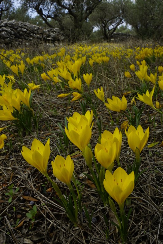 The autumn riches come thick and fast today with drifts of Crocus goulimyi mingled with white Crocus boryi and the dainty pink Colchicum psaridis and Allium callmischon. A ruined castle plays host to Narcissus serotinus and Spiranthes spiralis, whilst nearby rocky banks are peppered with the big goblets of Crocus niveus and these are also common among olive groves carpeted in Sternbergia lutea and Cyclamen graecum. Further south the rocks near the tip of the Mani have the showy Campanula versicolor. Overnight Githio.