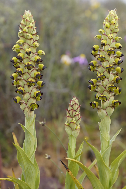 Making our way back west, we stop at another Overberg renosterveld patch holding a variety of Proteas and Ericas including the lovely Erica ampullacea. The diverse Fernkloof Nature Reserve will be our main destination, with a mixture of protea stands combined with the attractive coppery whorls of Leucospermum cordifolium, pink Phaeonocoma prolifera and abundant Dimorphotheca. These grow alongside the deep purple of Moraea livida. A yellow species is common on the higher slopes where the pretty white Gerbera tomentosa grows near seeps encrusted with Drosera slackii coloured by the rare inflated pink flowers of Disa pillansii. Another orchid purple-red Disa ophyridea grows near the fiery wands of Mimetes cucullatus. The views of the rugged coastline from above are superb. Back at sea level we will look for the peculiar deep red Gladiolus cunonius that grows on low cliffs in the town. Overnight Hermanus.